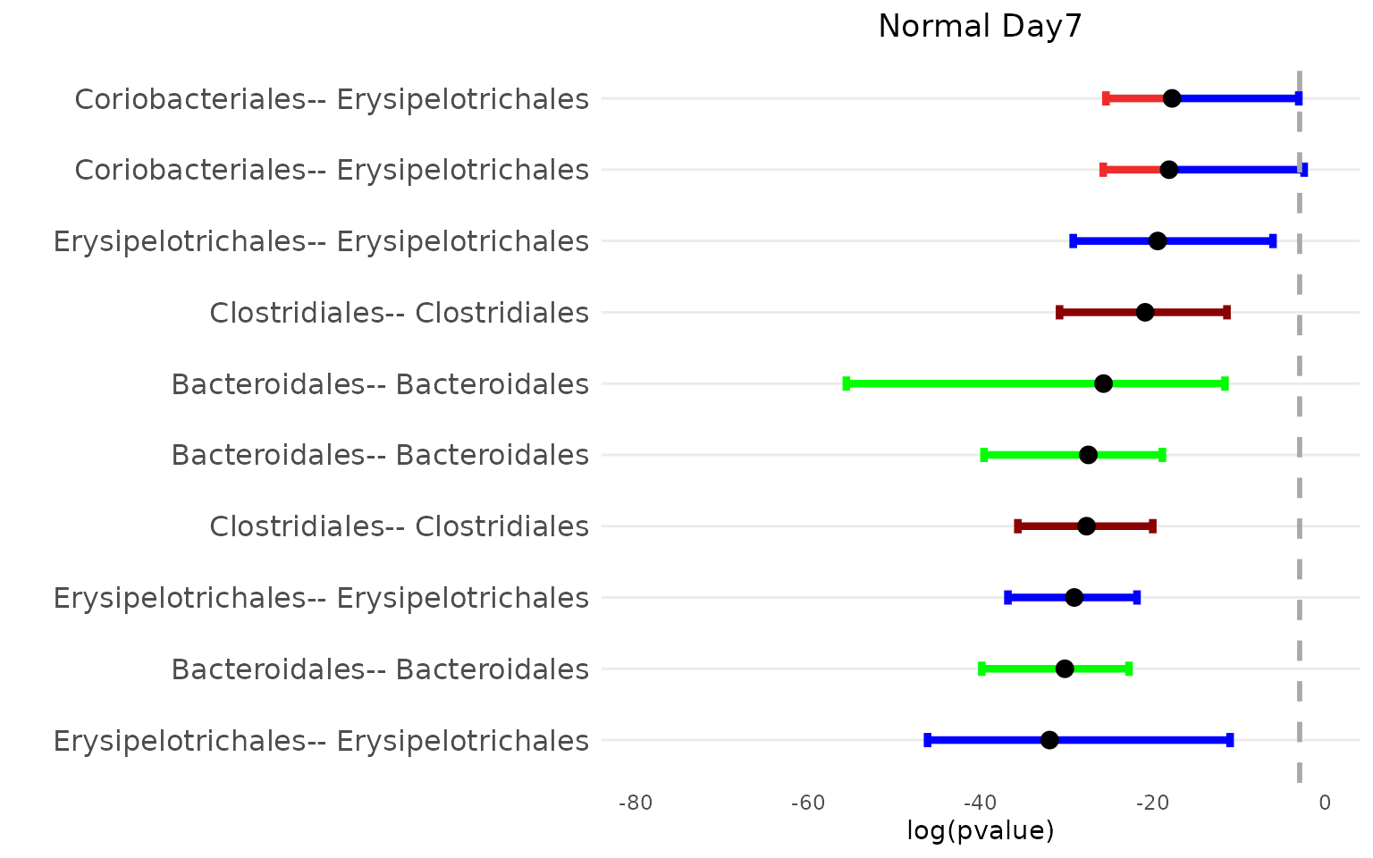 bpvalPlot_HFHS(netBoot_Normal$Day_4$median_mt, netBoot_Normal$Day_4$lower_mt, netBoot_Normal$Day_4$upper_mt, col_vec, 15, taxa_o, "Normal Day7")